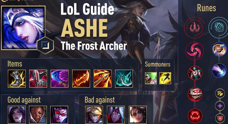 - Ashe là vị tướng, có khả năng dồn sát thương mạnh mẽ khi về cuối game và thả diều đối thủ cực kỳ tốt.